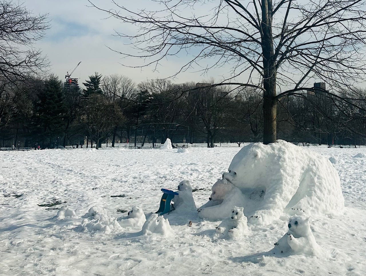 A massive snow sculpture of a mama bear nuzzling her baby polar bear, with other baby bears littered around them. ‘Build a bear’ had come alive in Central Park.
